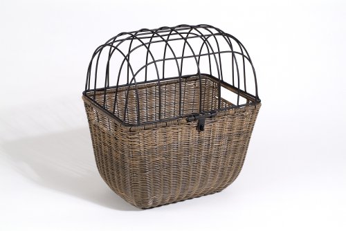 Nantucket Bike Baskets Surfside Wicker Pet Basket lt Brown. The Surfside Collection boasts a steel frame covered with a faux-rattan weave made out of highly durable vinyl. These baskets are made to withstand all the elements- sun, rain, snow- you name it! Complete with the handy quick release system, allowing you to easily remove the basket when you so desire. For quality and longevity, there is nothing better. This pet basket features a handlebar quick release bracket and should be used for small pets, 5 pounds and under. Wire cage top and pillow included. All baskets feature signature Nantucket Bike Basket Co. brass logo centered on the front.
